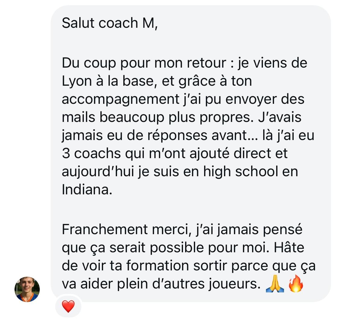 Oui, absolument. Tu n’as pas besoin d’être une superstar pour être recruté. Il existe des opportunités à tous les niveaux : centres de formation, NM3/NM2, JUCO, NAIA, prep schools, académies… Ce qui compte, c’est de savoir où te positionner et comment te présenter. La formation t’aide à viser les bons championnats et à présenter un dossier solide, même si tu viens de plus bas.